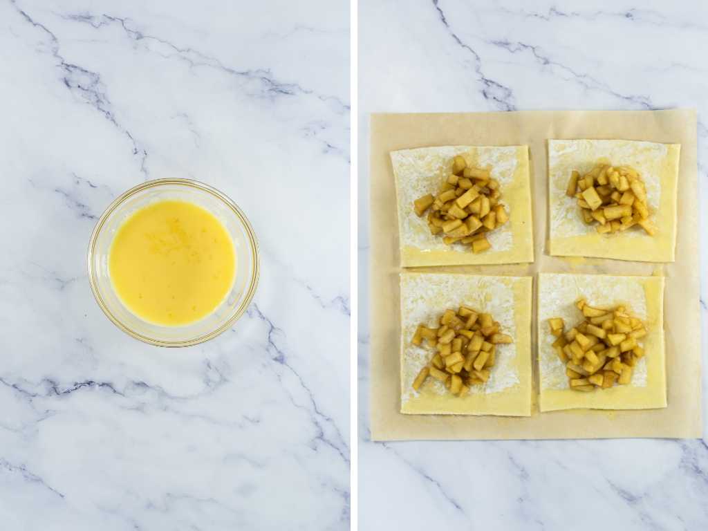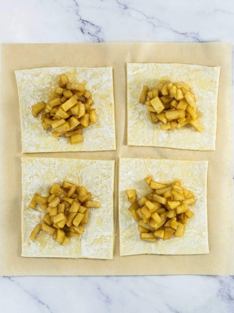 • Place a spoonful of the apple filling in the center of each pastry square, making sure to drain off any extra liquid so the pastry doesn’t get soggy.