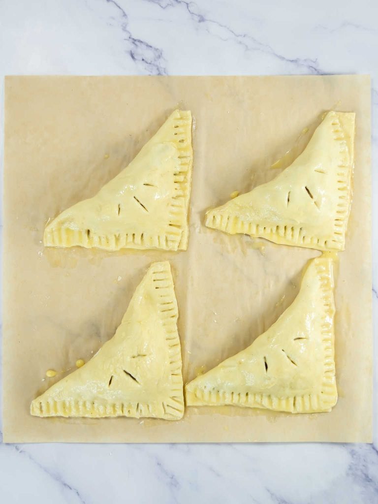 6. Fold each square over the filling to form a triangle. Press the edges together, then crimp with the tines of a fork to seal completely. Use a sharp knife to cut 2-3 small slits on the top of each turnover for ventilation. Brush the tops with the remaining egg wash.