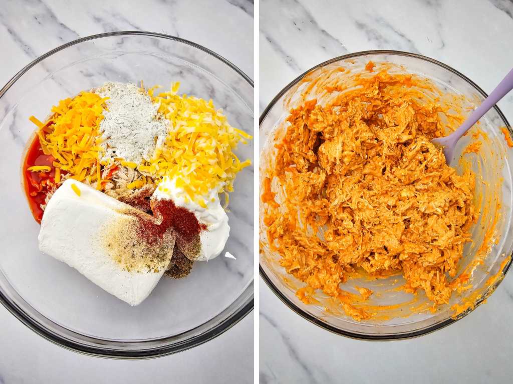 • In a large mixing bowl, combine the shredded chicken, cream cheese, sour cream, buffalo sauce, ranch seasoning, garlic powder, onion powder, paprika, oregano, and most of the shredded cheeses, reserving about ¼ cup of each cheese for the topping. Stir until everything is evenly mixed and creamy.