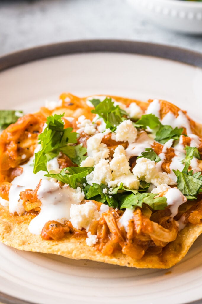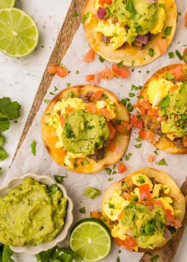 Breakfast Tostadas are crispy corn tortillas topped with breakfast sausage, scrambled eggs, melted cheese, pico de gallo, and guacamole. They’re hearty, savory, and perfect for brunch or feeding a crowd.