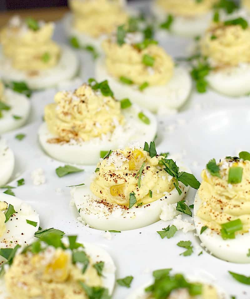 Mexican Street Corn Deviled Eggs are classic deviled eggs mixed with corn, mayo, sour cream, and spices inspired by elote flavors. They’re creamy, savory, and perfect as a party appetizer or bite-sized snack.