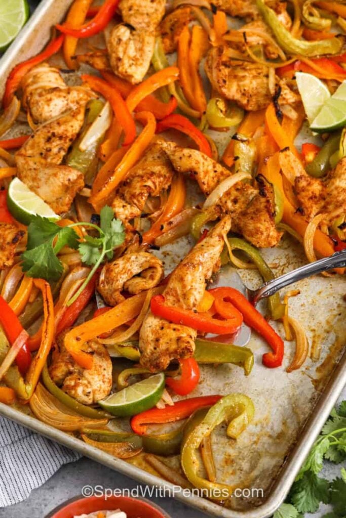 Sheet Pan Chicken Fajitas are seasoned chicken strips and sliced peppers baked together on one pan until tender and juicy. They’re simple, flavorful, and perfect for feeding a crowd at a party or dinner.