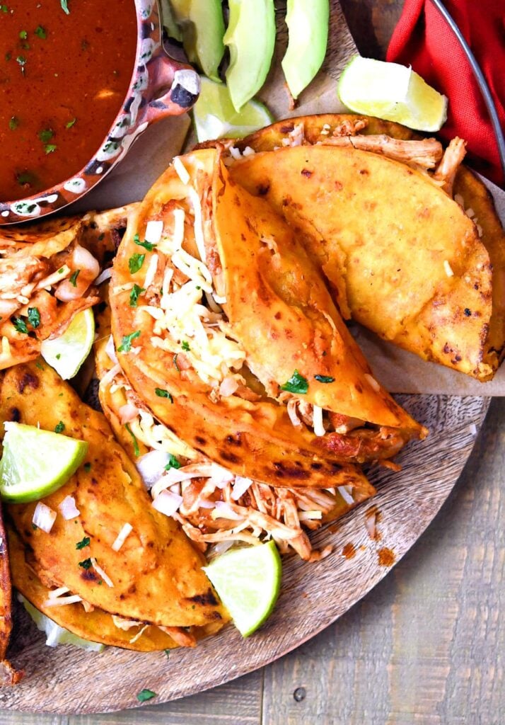 Chicken Birria Tacos are crispy, cheesy tacos filled with tender chicken braised in a rich red chile adobo sauce. They’re served with a flavorful consommé for dipping, creating a bold and satisfying Taco Tuesday meal.
