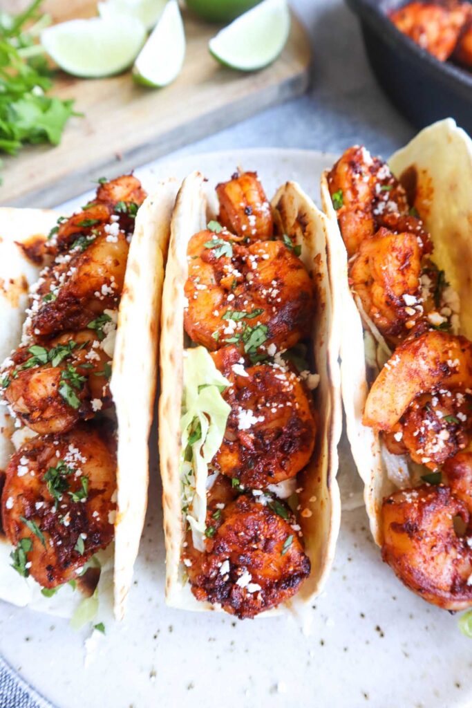 Easy Tacos de Camaron are fresh and flavorful with pan-seared shrimp seasoned with chili powder, smoked paprika, and garlic. Served in warm tortillas with lettuce, cotija cheese, cilantro, and lime, they come together in under 30 minutes for a quick and satisfying meal.