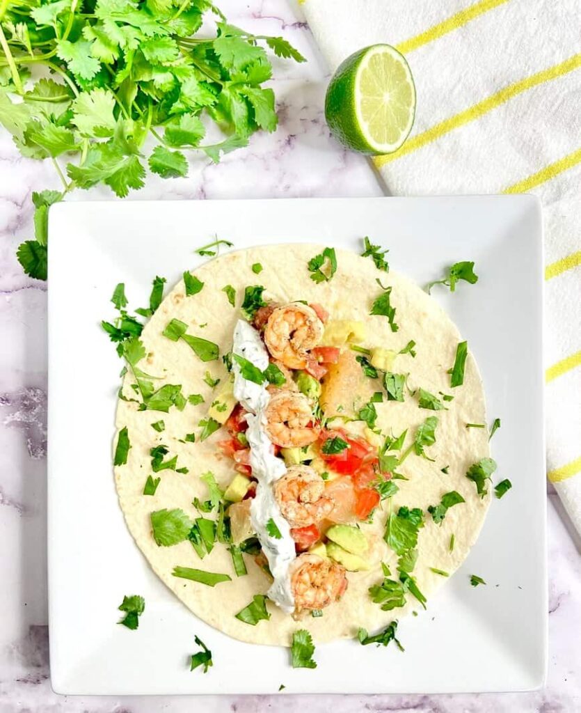 Shrimp Tacos with Avocado, Grapefruit, and Creamy Cilantro Sauce are fresh and vibrant with slightly spicy shrimp, creamy avocado, and bright citrusy grapefruit salsa. Finished with a creamy cilantro sauce, these tacos deliver a flavorful mix of sweet, tangy, and savory in every bite.
